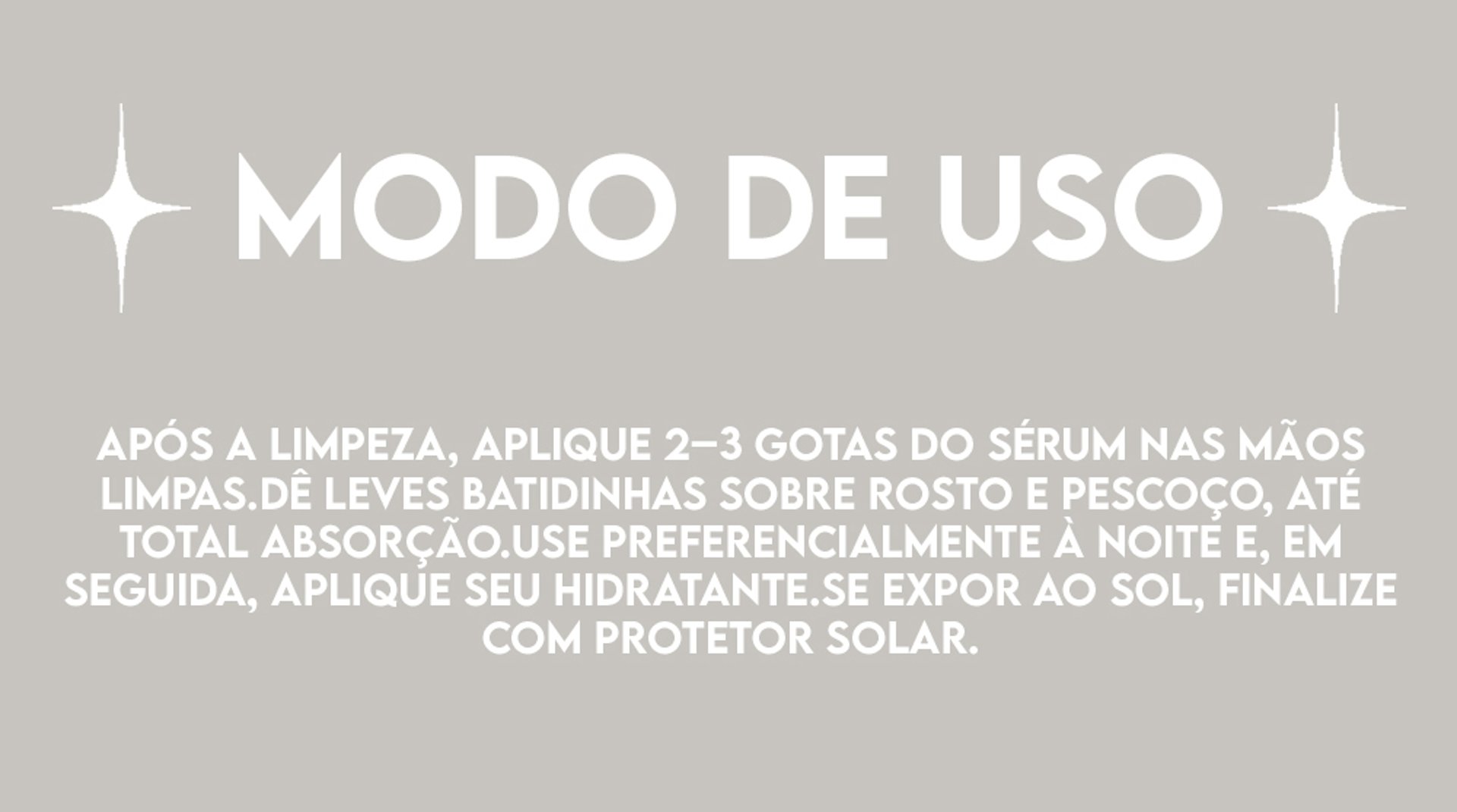 Após a limpeza, aplique 2–3 gotas do sérum nas mãos limpas.Dê leves batidinhas sobre rosto e pescoço, até total absorção.Use preferencialmente à noite e, em seguida, aplique seu hidratante.Se expor ao sol, finalize com protetor solar.