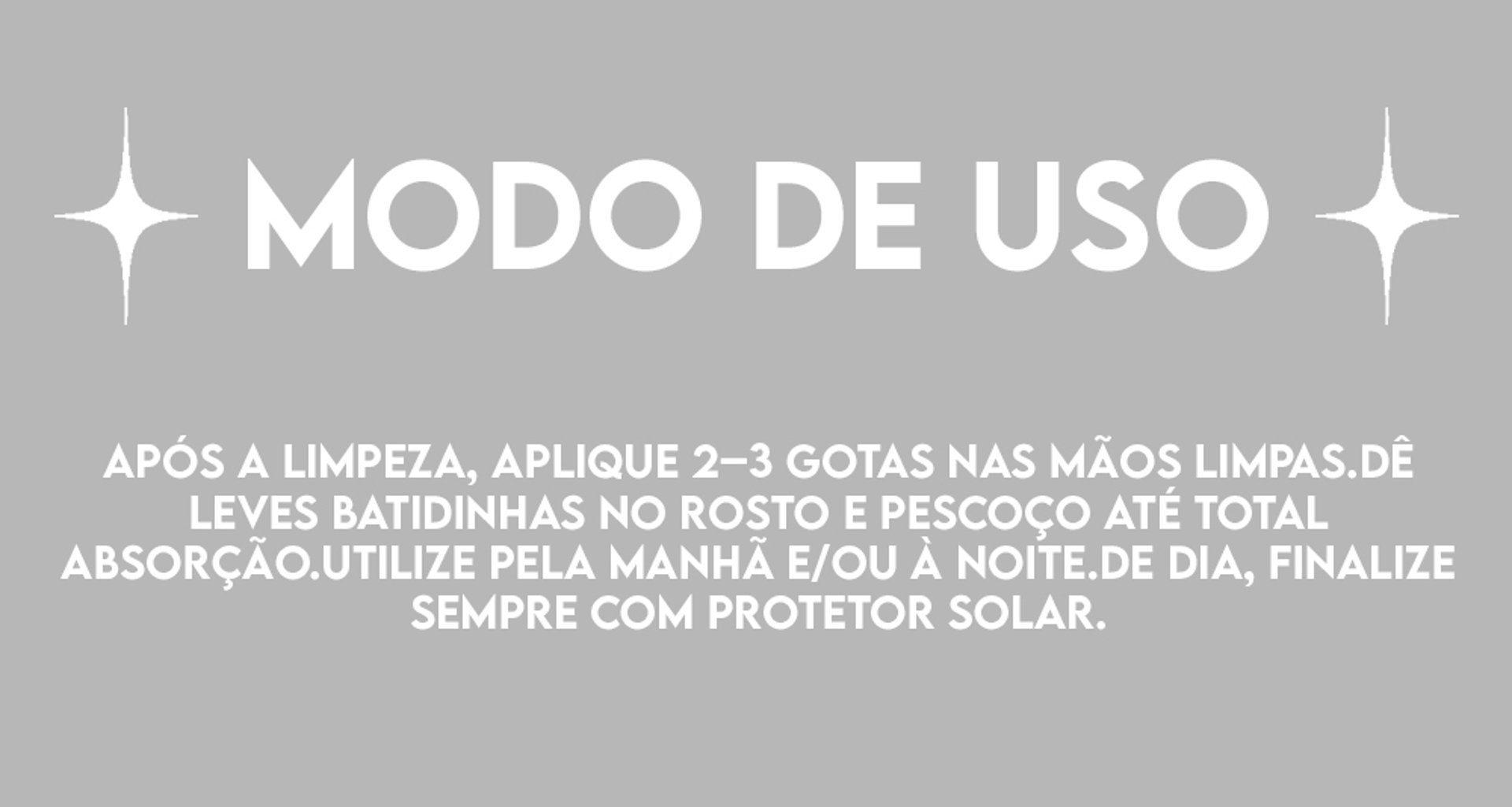 Após a limpeza, aplique 2–3 gotas nas mãos limpas.Dê leves batidinhas no rosto e pescoço até total absorção.Utilize pela manhã e/ou à noite.De dia, finalize sempre com protetor solar.